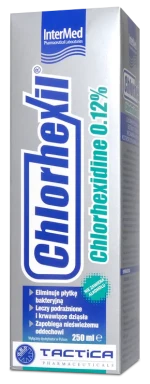 Płyn do płukania jamy ustnej - unikatowe połączenie chlorheksydyny 0,12% z ekstraktami ziołowymi (rumianek pospolity, balsamowiec mirry, pastwin trójpręcikowy). Chlorhexil pomaga utrzymać prawidłową mikroflorę jamy ustnej, zapobiega rozwojowi próchnicy zębów i wzmacnia dziąsła. Dzięki zawartości ekstraktów ziołowych z rumianku pospolitego, balsamowca mirry i pastwinu trójpręcikowego skutecznie i szybko usuwa płytkę bakteryjną, której rozwój stanowi główną przyczynę chorób dziąseł i przyzębia. Eliminuje płytkę bakteryjną. Leczy podrażnione i krwawiące dziąsła. Zapobiega nieświeżemu oddechowi. Nie zawiera alkoholu.